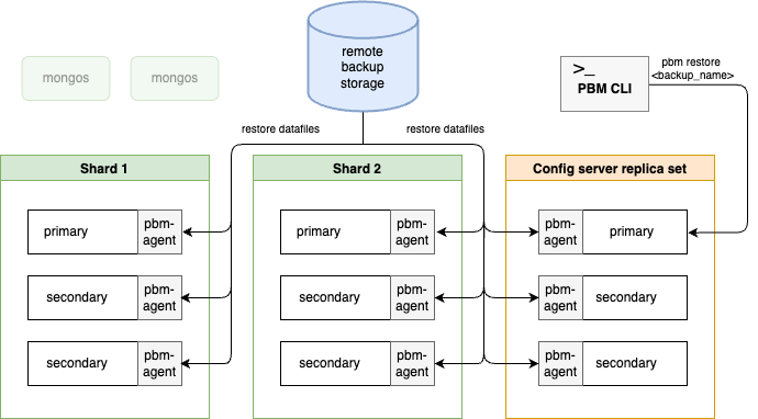Physical restore is the reverse process: pbm-agents shut down the mongod nodes, clean up the dbPath data directory and copy the physical files from the storage to it.